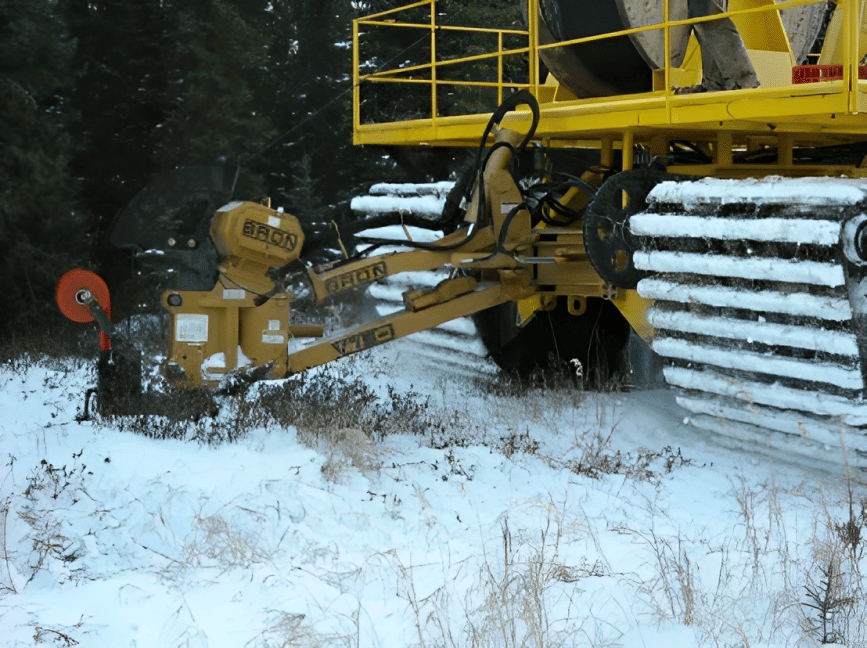 This custom buggy was created to plow fiber-optic cable through a frozen wetland in the tundra. It plowed almost 900 miles of fiber through northern Canadaian muskeg. It buried ½” cable 32” deep with a Broun V-75 and never even hooked up the vibratory-- it was pulled completely static!