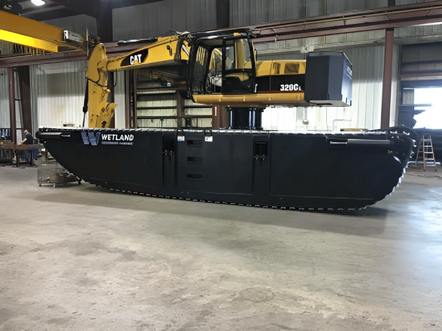 We recently built and designed this a custom lifted amphibious excavator for a customer in Venezuela. He uses it in a transition zone near the ocean for pipeline work.