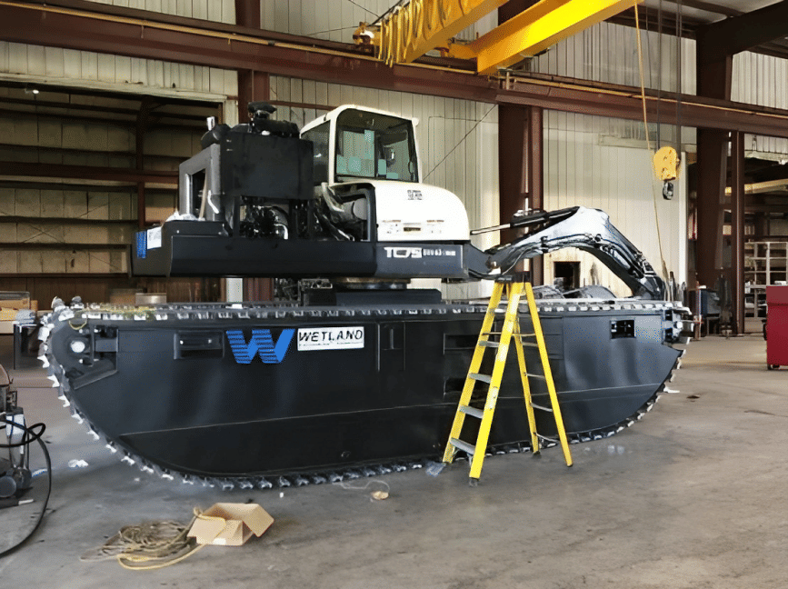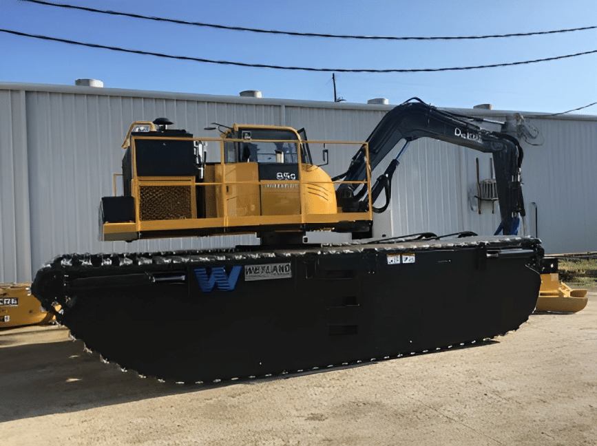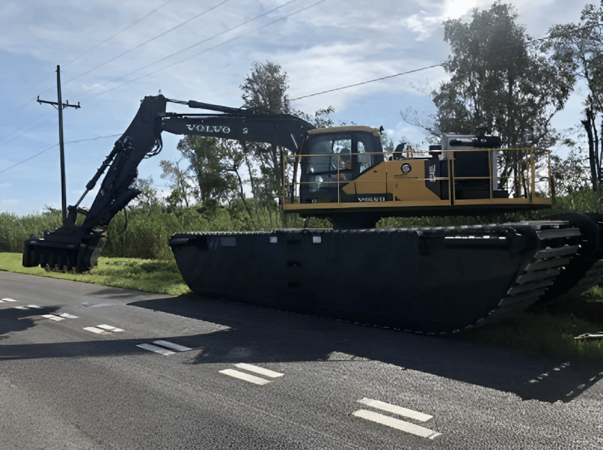 These custom mini amphibious excavators have an auxiliary engine 3 times larger than an excavator engine. The auxiliary engine is designed to work at maximum production cutting trees while maintaining full power to the excavator. You are able to cut trees without having to wait for the cutter head to come back up to speed after cutting every tree.