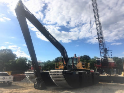 Check out the 6th amphibious machine since the 1990s. All are in working condition! A Volvo 300 with 60’ super long reach, auxiliary fuel tank/counterweight and walkways with handrails.